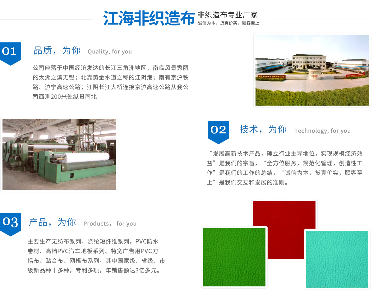 江海企業(yè)有江陰市江海非織造有限公司、江陰市江海防水材料有限公司、江陰市三江寬幅無紡布有限公司、江陰市三江織物涂層新材料有限公司組成,均屬于江蘇省民營(yíng)科技企業(yè)。企業(yè)現(xiàn)擁有員工近千名,占地15萬平方米,廠房建筑面積達(dá)80000多平方米,凈資產(chǎn)超億元,主要生產(chǎn)無紡布系列、滌綸短纖維系列、PVC防水卷材、高檔PVC汽車地板系列、特寬廣告用PVC刀括布、貼合布、網(wǎng)格布系列,其中國(guó)家級(jí)、省級(jí)、市級(jí)新產(chǎn)品十多種,專利多項(xiàng),年銷售額達(dá)3億多元。
